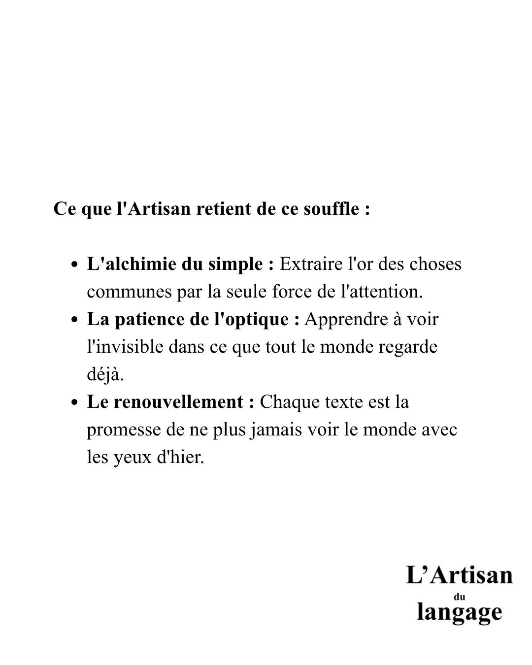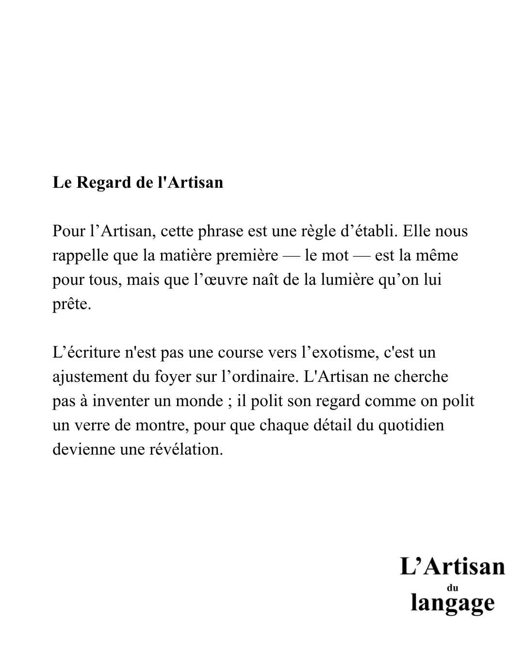 L'Artisan ne cherche pas l'exotisme des mots rares ; il polit son regard pour que l'ordinaire s'illumine enfin. Écrire, c'est apprendre à redécouvrir ce que l'on pensait déjà connaître.
